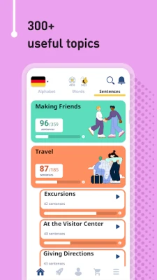 • 5,000 German phrases (frequently used): the most important phrases for daily conversations and travelling, categorized into 10 levels and 120 topics.