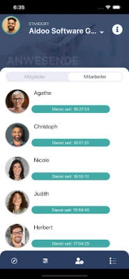 Mitarbeiter können darüber ihre Arbeitszeiten ganz einfach erfassen, Trainer können Termine mit Mitgliedern abrufen und bearbeiten. Welche Termine stehen heute an? Ist die Woche bereits ausgelastet oder optimal belegt? Ein Klick auf das Terminsymbol ruft direkt den eigenen Kalender auf. In der Detailansicht sind dann alle wichtigen Termin-Infos sichtbar: Dauer des Termins, wichtige Infos zum Termin und zum Mitglied sowie Mitgliederdaten mit Foto uvm. Ein Blick in die Aidoo Software Company App verrät auch direkt wer gerade im Studio anwesend ist, natürlich auch hier mit Details, so dass auch eine direkte Terminvereinbarung möglich ist.