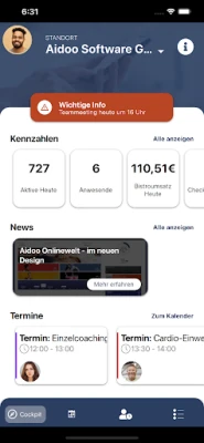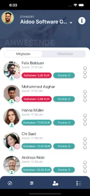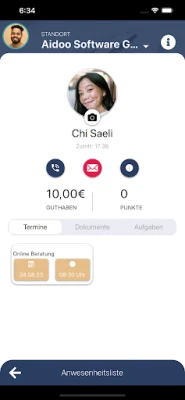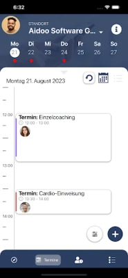 Mitarbeiter können darüber ihre Arbeitszeiten ganz einfach erfassen, Trainer können Termine mit Mitgliedern abrufen und bearbeiten. Welche Termine stehen heute an? Ist die Woche bereits ausgelastet oder optimal belegt? Ein Klick auf das Terminsymbol ruft direkt den eigenen Kalender auf. In der Detailansicht sind dann alle wichtigen Termin-Infos sichtbar: Dauer des Termins, wichtige Infos zum Termin und zum Mitglied sowie Mitgliederdaten mit Foto uvm. Ein Blick in die Aidoo Software Company App verrät auch direkt wer gerade im Studio anwesend ist, natürlich auch hier mit Details, so dass auch eine direkte Terminvereinbarung möglich ist.