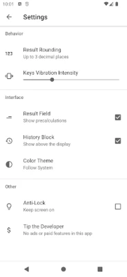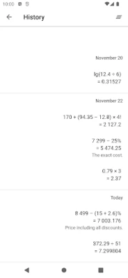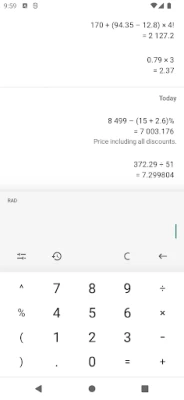 Calculator with percentages, powers and functions. History with comments. Cursor for editing anywhere. Simple interface with dark and light themes.